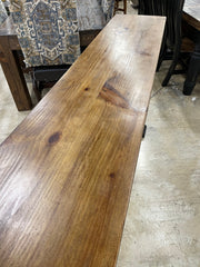 Rustic console table crafted from reclaimed wood, featuring a long, clean-lined tabletop that highlights the natural grain, knots, and character marks of the wood. The base showcases bold, hand-carved pedestal legs with a distressed black finish, connected by a sturdy stretcher for added stability. A carved apron detail beneath the top adds depth and artisanal character, creating a striking contrast with the warm wood tone. Ideal for entryways, behind sofas, or as a statement accent in rustic, hacienda, or farmhouse-style interiors.