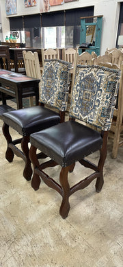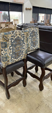 These elegant counter-height stools feature a solid wood frame with a rich dark finish, paired with a comfortably padded seat upholstered in smooth, dark leather. The upholstered back showcases a Southwestern-inspired patterned fabric, accented with decorative nailhead trim for added character and detail. Gently curved legs provide stability and a classic silhouette, making these stools both stylish and functional.
