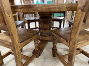The 72β Reclaimed Wood Round Dining Table with 6 Chairs is crafted from solid reclaimed wood, showcasing rich character, natural grain patterns, and authentic texture throughout. The round tabletop features a beautiful plank-style design, while the sturdy pedestal base provides excellent stability and generous legroom. The set includes six matching solid wood chairs with supportive backs and thick seats, built for everyday durability and comfort. A perfect centerpiece for dining rooms with rustic, farmhouse, or hacienda-style dΓ©cor.