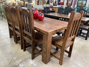 The 84ā Reclaimed Wood Dining Table with 5 Chairs and Bench is crafted from solid reclaimed wood, highlighting rich natural grain, knots, and authentic character throughout. The spacious rectangular tabletop is supported by thick, solid legs, providing exceptional stability and a bold rustic presence. This set includes five matching solid wood chairs with supportive slatted backs, along with a coordinating bench for versatile seating and a relaxed farmhouse feel. Perfect for family gatherings and entertaining, this set fits beautifully in rustic, farmhouse, or hacienda-style dining spaces.
