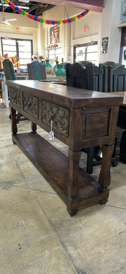 This beautifully crafted console table features a rich wood finish with hand-carved drawer fronts that add depth and character. Designed with three spacious drawers for storage and a full lower shelf for décor or baskets, this piece combines functionality with timeless rustic style. Its long, narrow profile makes it ideal for entryways, living rooms, or behind a sofa.