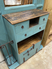 Rustic hall tree crafted from solid pine wood, finished in a distressed turquoise tone that adds character and charm. This piece features a built-in mirror, decorative wrought iron accents, and metal hooks for hanging coats, hats, or bags. The lower section offers practical storage with drawers, open shelving, and a cabinet, making it both functional and stylish. Accented with rustic iron hardware and a contrasting wood top, it’s ideal for entryways, mudrooms, or hallways with rustic, farmhouse, or Mexican-style décor.