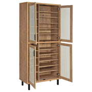 Enhance your entryway with this stylish shoe cabinet, pairing natural oak hues with modern, functional details. Crafted from engineered wood and laminate veneer, it features double doors framed by airy metal cane-style panels. Inside, an off-centered division and multiple adjustable shelves accommodate various shoe sizes, ensuring a personalized storage solution. Sturdy black metal legs anchor the piece, delivering a contemporary look that effortlessly streamlines your footwear collection. Key Features: • A chic shoe cabinet dressed in a natural oak finish • Airy metal cane-style door panels for ventilation and visual interest • Off-centered interior division and adjustable shelves for flexible storage • Engineered wood and laminate veneer construction ensures lasting quality • Supported by sturdy black metal legs for modern appeal • Perfect for organizing footwear in entryways, hallways, or closets