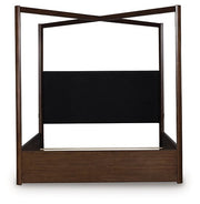 Casual contemporary styling with a decidedly modern vibe. Bathed in a rich dark brown finish, this queen canopy bed is warm and inviting. Its integrated “X” canopy and full wrap-around rails set to the floor adorn your restful retreat with on-trend elegance. Dual USB charging on both sides of the upholstered headboard is a subtly cool way to keep your electronics at the ready. What a simply stunning way to achieve the bedroom of your dreams.