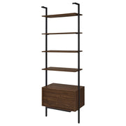 Play up the light, airy ambiance of a modern space while making use of every inch with a modern wall bookcase. It features four floating upper shelves and a lower case with two drawers, perfect for a blend of storage and display in any room. The shelves and two drawers feature a warm walnut finish over melamine paper, offering durability for a lovely look that lasts. A black finish metal frame supports the bookcase, offering neutral appeal in any setting. Stash essentials in the drawers while adding decor to shelves for a personal look and feel. Key Features: • Achieve a minimalist look with the open, airy style of a modern four-shelf wall bookcase • Features four floating shelves and two drawers for a light, refined look in your bedroom or den • Shelves and drawers feature a deep walnut wood finish over melamine paper that's durable and stylish • Metal frame features clean, straight lines and a rich black finish for neutral appeal • Adds storage and maximizes space beside an entertainment center or in a home office