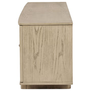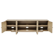 This 79-inch TV stand captures California coastal modern living with a balance of authenticity and ease. Inspired by 1970s silhouettes, its streamlined rectangular case is fitted with four framed doors featuring woven cane fronts, bringing natural texture and depth. Crafted from solid poplar, engineered wood, and oak veneer, it ensures durability with timeless appeal. Designed as a media console or entertainment center, it accommodates up to an 85-inch TV while offering concealed storage for electronics and essentials._x005F_x000D_ Key Features: • TV stand measuring seventy nine inches with framed doors and woven cane panel fronts • Entertainment center accommodates TVs up to 85 inches in size with ease • Solid poplar, engineered wood, and oak veneer construction ensures lasting strength • Four doors conceal ample storage space for electronics, games, or living essentials • Streamlined rectangular profile reflects seventies inspired coastal modern design • Media console combines natural textures with durable build for long term function